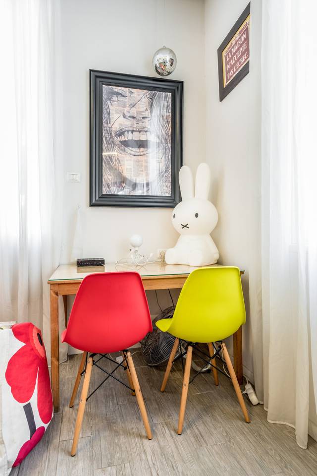 This colorful and inviting apartment features two bedrooms, each with its own private bathroom—one with a shower and the other with a bathtub. A comfortable sofa bed in the living area offers additional sleeping space; guests must request preparation at least 48 hours in advance through the management team.